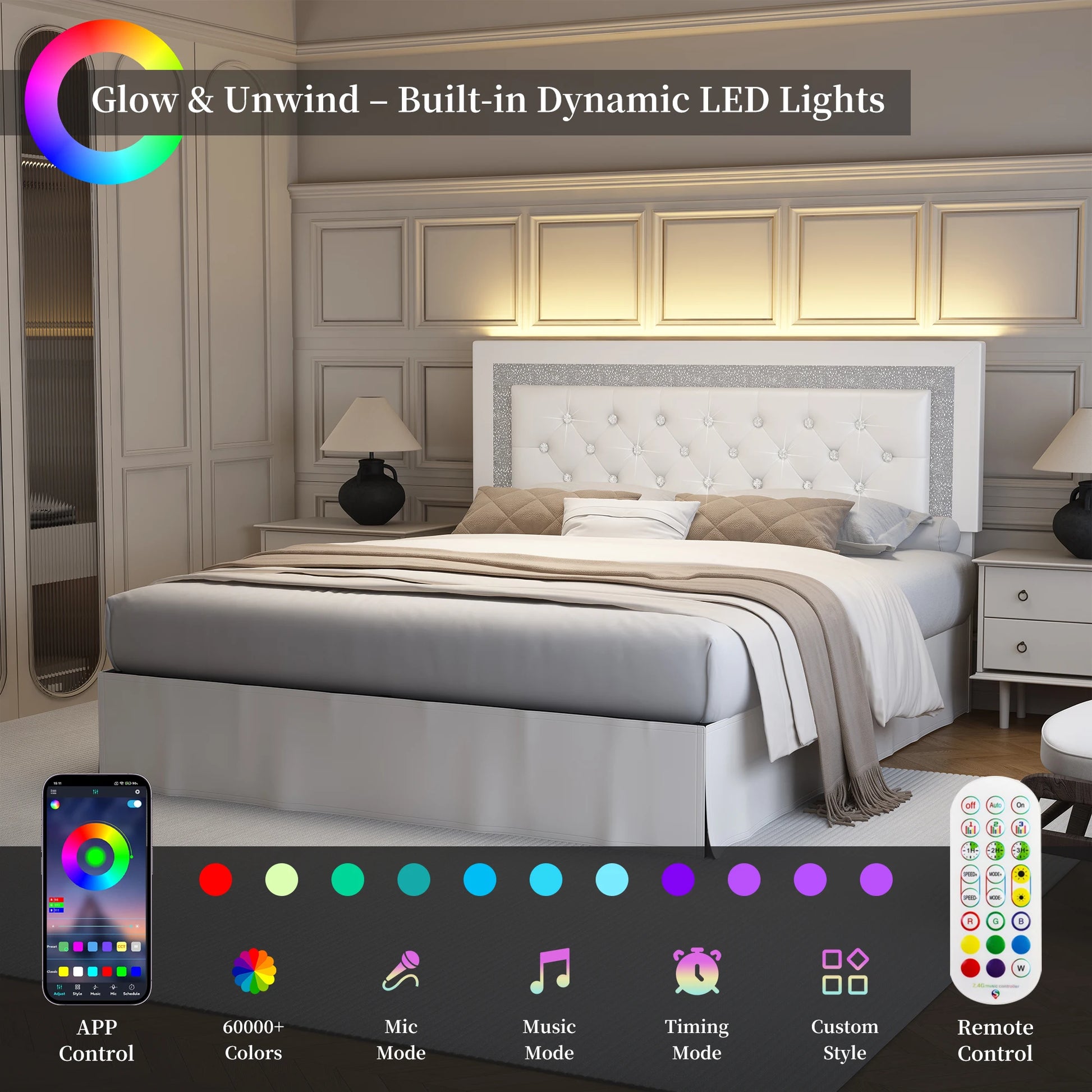 - RGB LED Lights integrated into the headboard with remote and app control for endless color options and lighting modes that set the mood for relaxation or entertainment.
